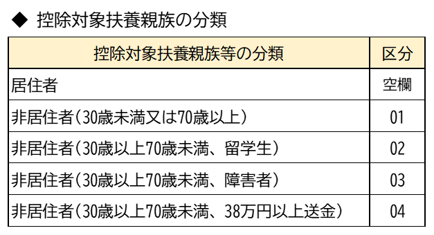 基本的には「空欄」、特定親族や非居住者に該当する場合には、これらの数字を区分欄に記入することとなります。